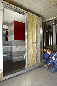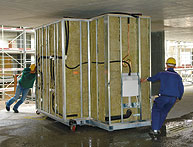 Anwendung bei Sanierung oder Umbau. Die Fertigbäder werden in fabriksmäßig produzierten Elementen angeliefert, vor Ort vertragen und zusammengebaut. Die jeweilige Elementgröße richtet sich nach den zur Verfügung stehenden Einbringöffnungen.