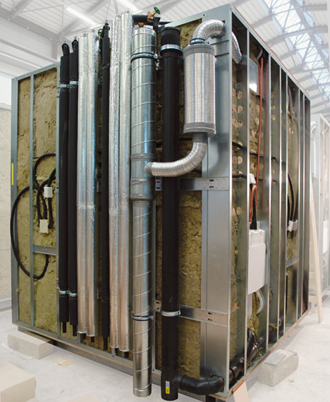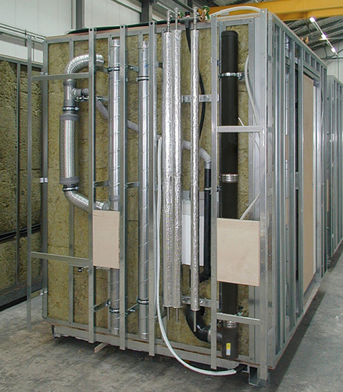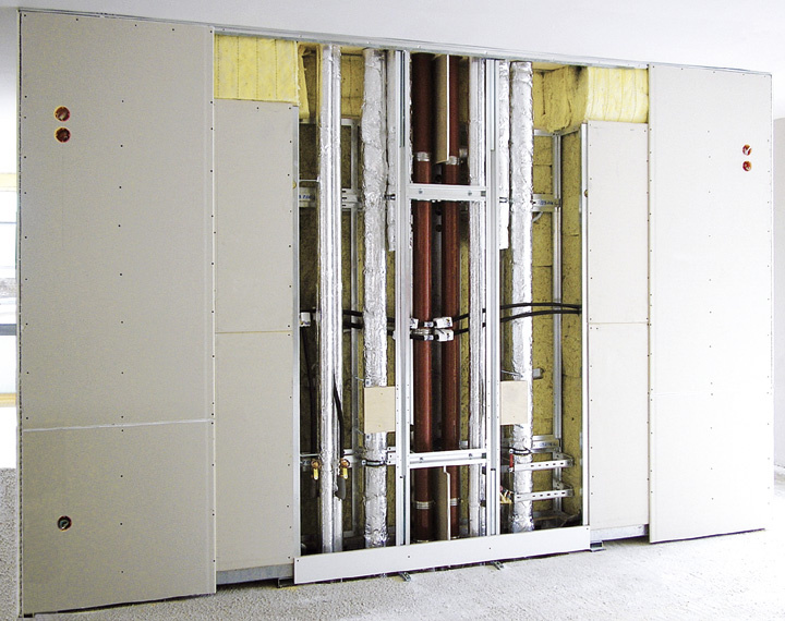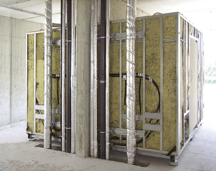 Um den vorhanden Platz so optimal wie möglich auszunutzen, kann die Schachtinstallation ins Fertigbad integriert werden. Es besteht die Möglichkeit, pro Fertigbad eine Schachtinstallation oder, wenn es die Gegebenheiten erlauben, für zwei Fertigbäder eine gemeinsame Schachtinstallation vorzusehen.