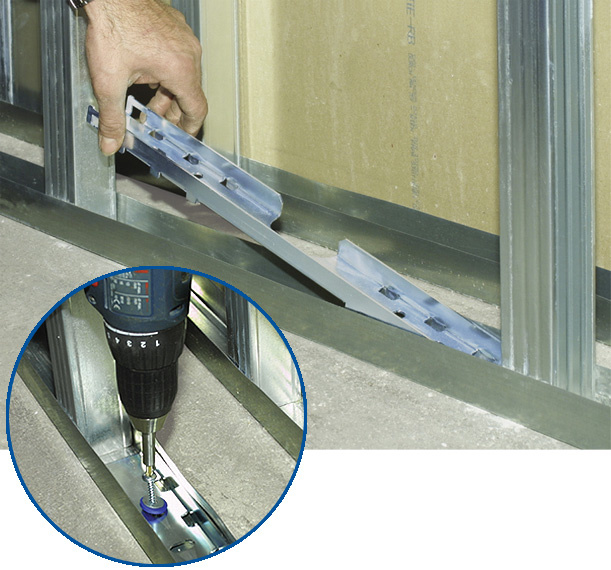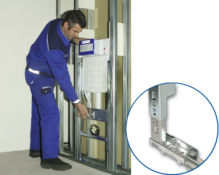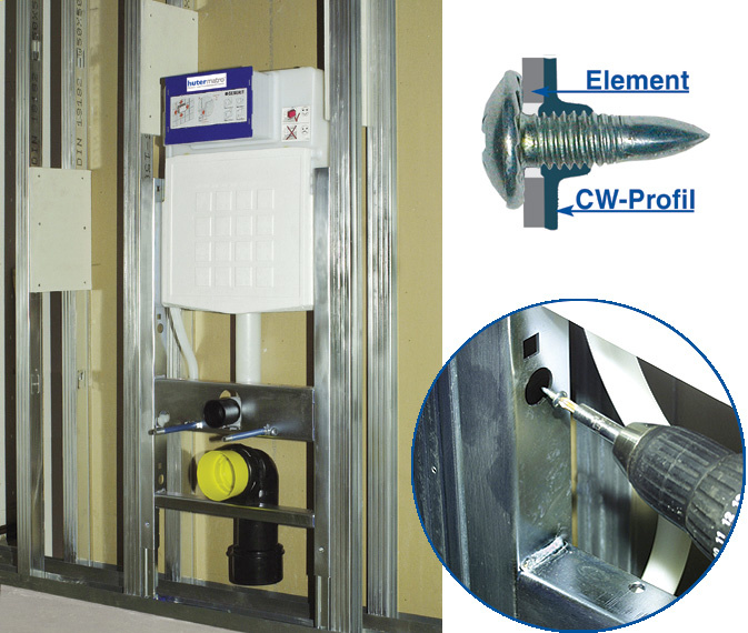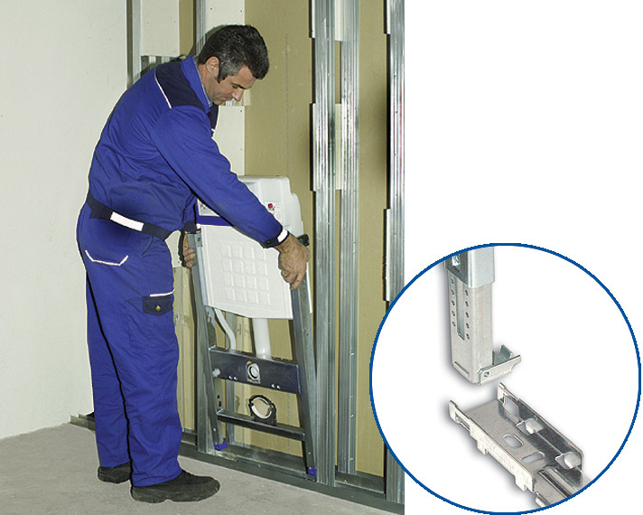 Die Montageschiene kann vorab in die Bodenschiene des Trockenbauers montiert werden. Somit kann der Trockenbauer seine Steher setzen und die Rückwand bereits beplanken. Das Montageelement wird anschließend vom Installateur in die Montageschiene eingeklipst, eingerichtet und seitlich mit Spezialschrauben an den CW-Profilen befestigt.