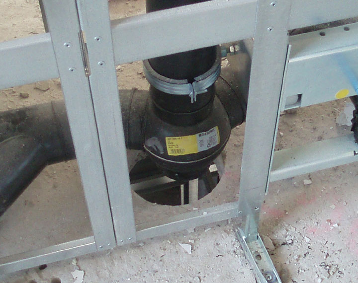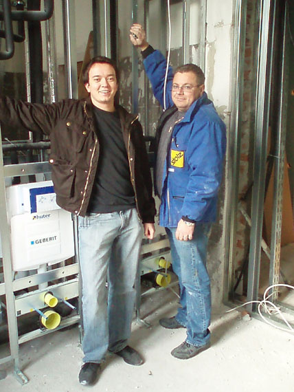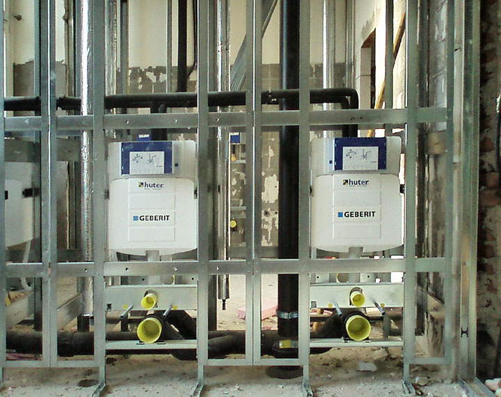 Für die Sanierung des Amtsgebäudes lieferte Huter Schachtinstallationselemente in welche je 3 x 2 Stück WC-Unterputzelemente Rücken an Rücken, Anschlüsse für externe Waschtische und Behinderten WC´s, Abwasserstrang, Regenrohr, KW, WW sowie Zirkulationsleitungen mit Gruppenabsperrungen eingebaut waren.