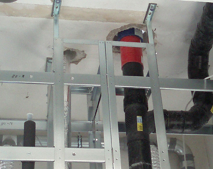 Bei der Sanierung des bestehenden Gebäudes war die Statik ein Thema. Aufgrund des geringen Eigengewichts der Huter Leichtbauelemente wurden die Decken nicht übermäßig belastet. Die notwendigen Deckendurchbrüche wurden mit Kernlochbohrungen durchgeführt.